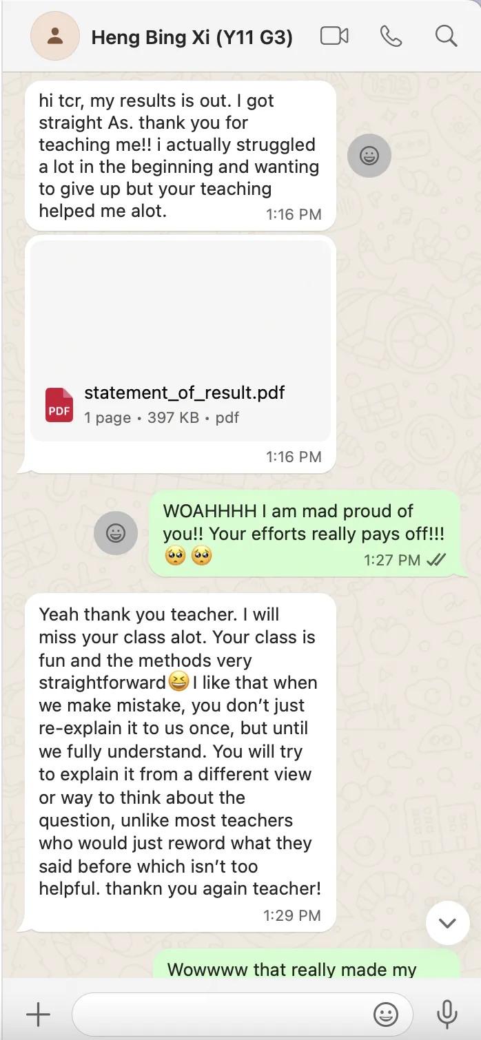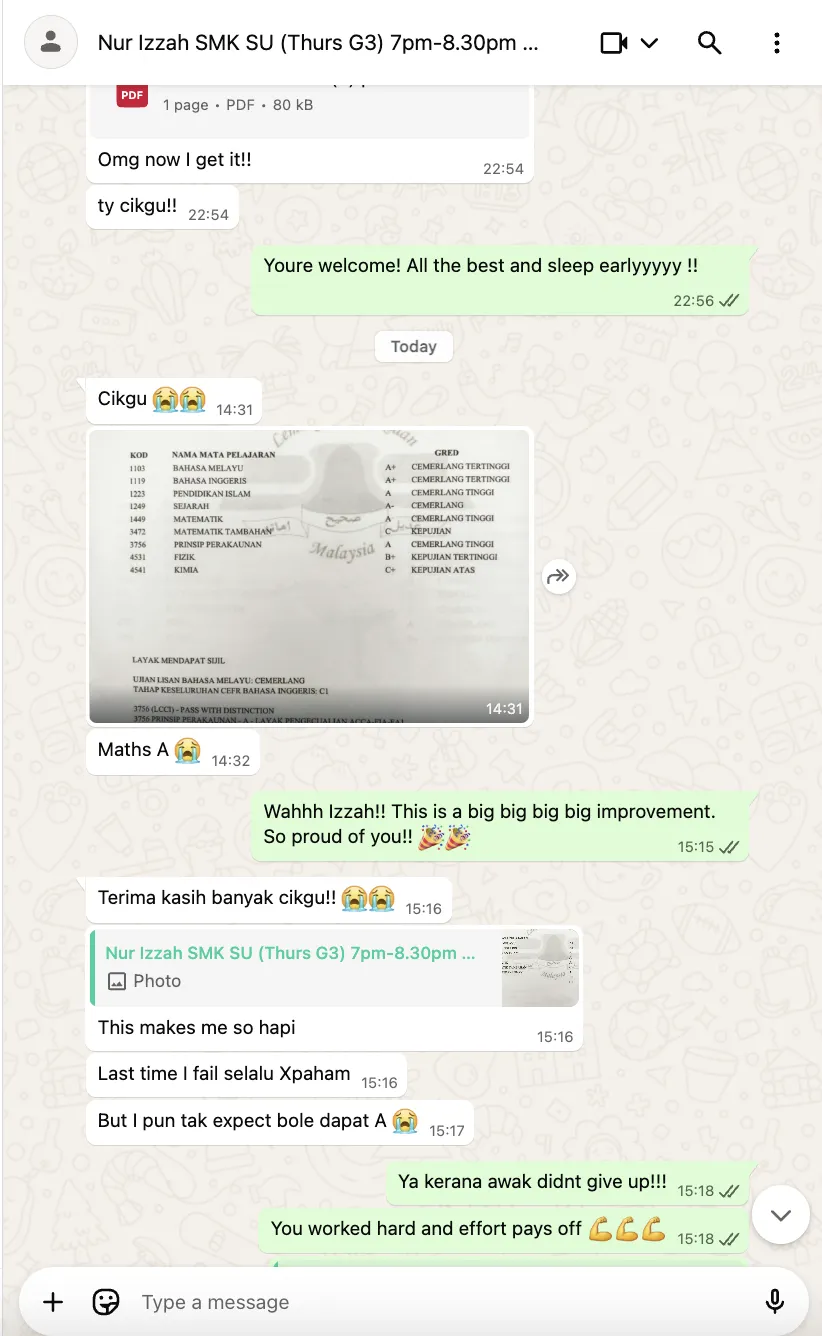 Successfully guided 150+ students to A/A* grades in major exams, including students who started weak in Mathematics and Add Maths